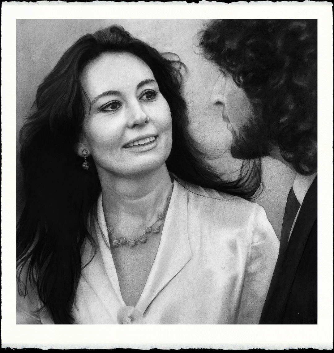 61,5 x 61.5 cm | Mujer de cabello largo y negro, vestida con camisa de seda, mira y sonríe a su amado